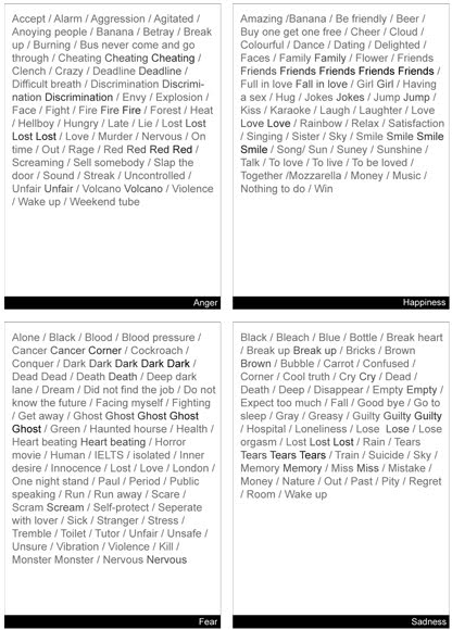People in different moods sense different feelings. In the beginning I asked people of different ages, locations and occupations to randomly write down their different feelings of certain words and emotions. The words of the data collected were interesting but hard to read. (Fig1)